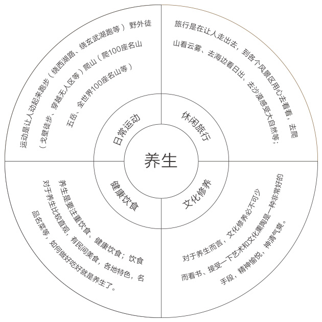 黄帝内经的核心是服务,表现是养生之道,养生在《黄帝内经》中体现为怡情养性,比如在饮食上:贵人就是认清自己,吃当季菜。养生表现为运动,旅行,饮食、精神调养等方面;通过养生文化把品牌服务理念给夯实,通过养身之道来拓展品牌文化,并以消费者能切身感受的形式来传递;让消费者能够参与到品牌文化的传播中来;